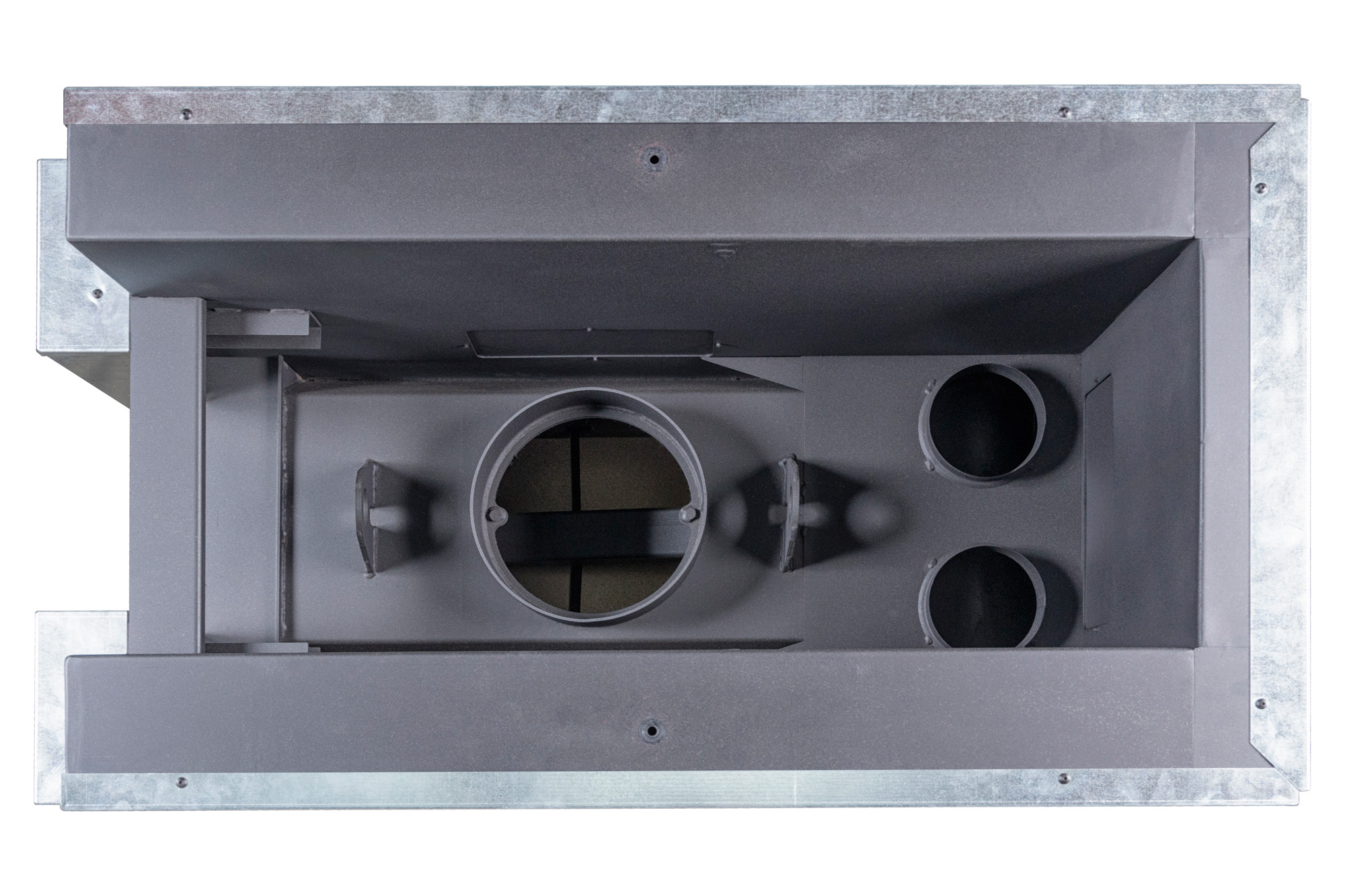 - Система забора воздуха извне, имеет два встроенных патрубка диаметром 125 мм для подключения забора воздуха на горение из соседнего помещения, улицы, подвала, и повышает надежность работы топки.