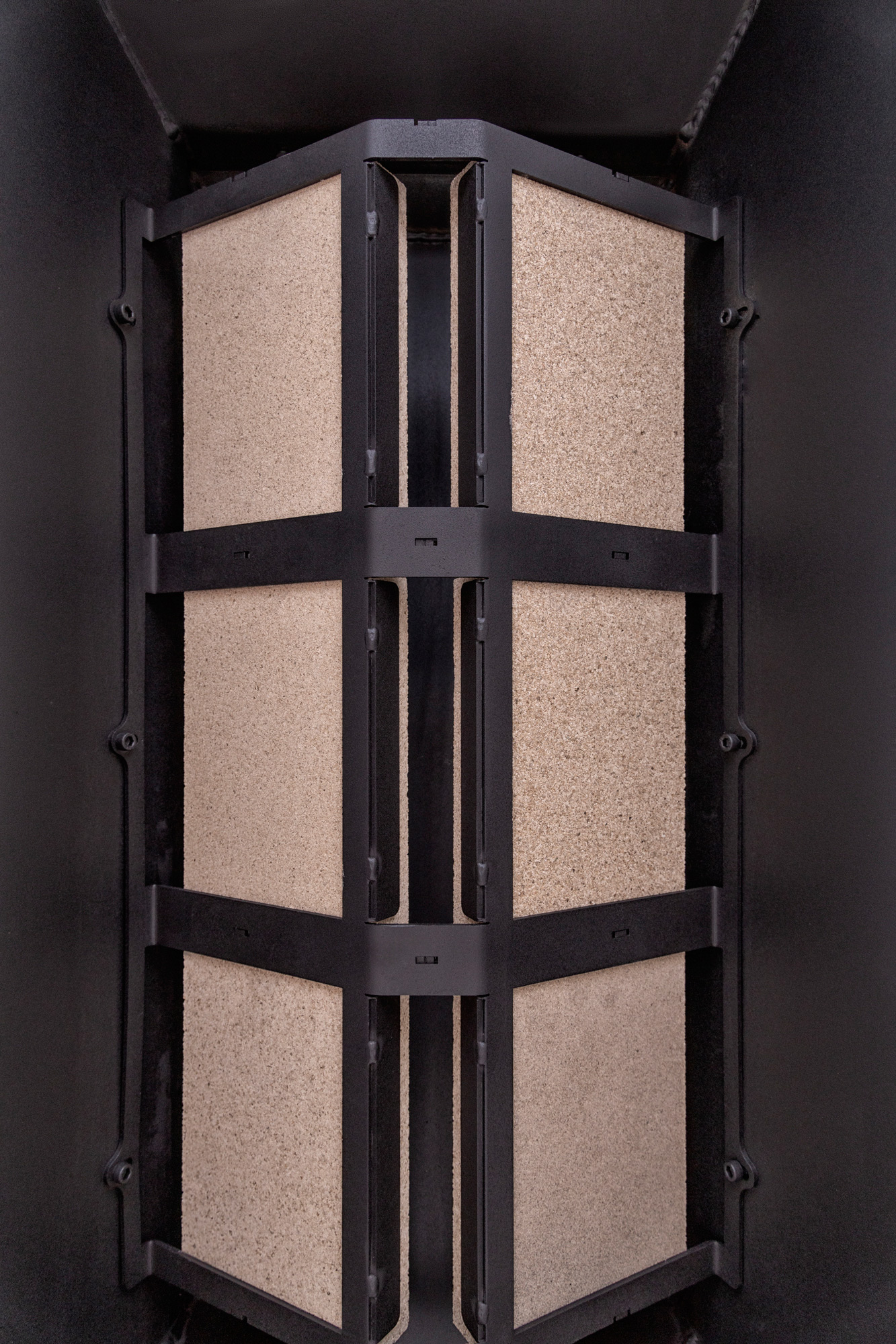 - Топочная камера футерована современным материалом, литьевым шамотом бежевого или черного цвета (по желанию покупателя) и надежно защищает металлические детали корпуса топки от перегрева.