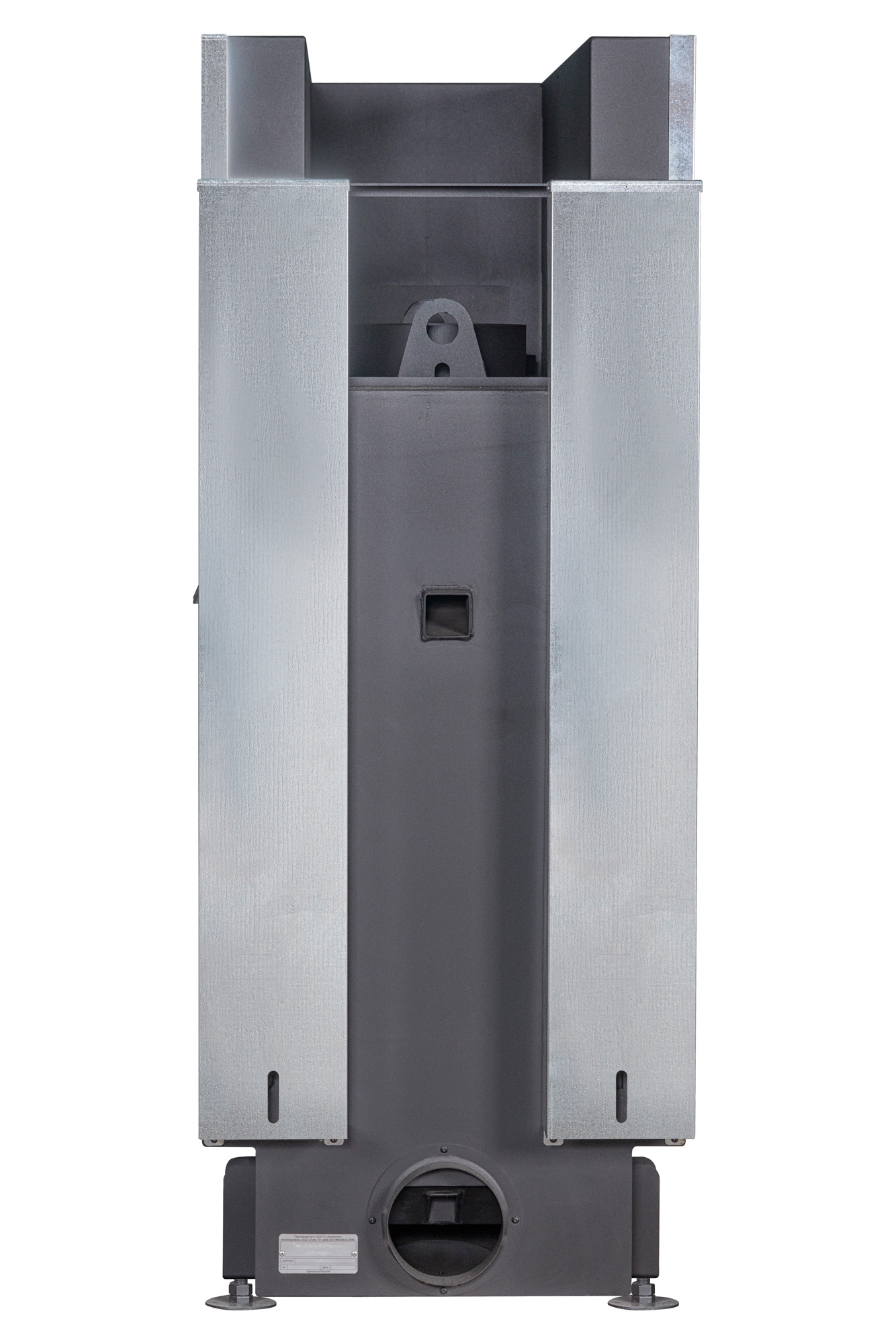 - Система забора воздуха извне, имеет два встроенных патрубка диаметром 125 мм для подключения забора воздуха на горение из соседнего помещения, улицы, подвала, и повышает надежность работы топки.