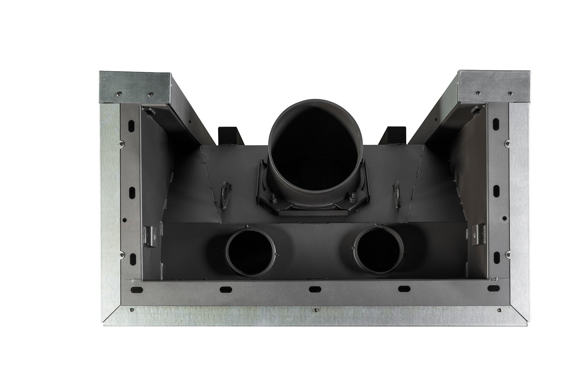 - Система забора воздуха извне, имеет два встроенных патрубка диаметром 125 мм для подключения забора воздуха на горение из соседнего помещения, улицы, подвала, и повышает надежность работы топки.