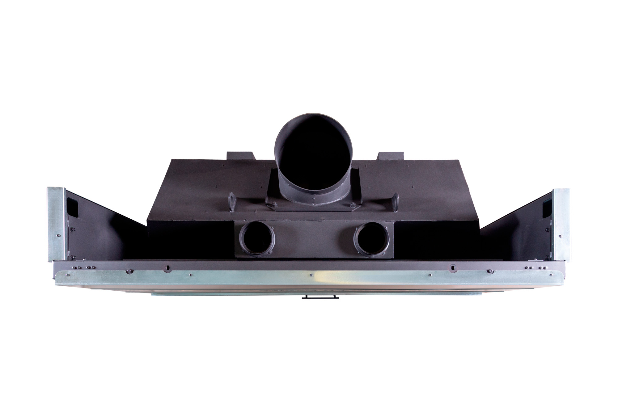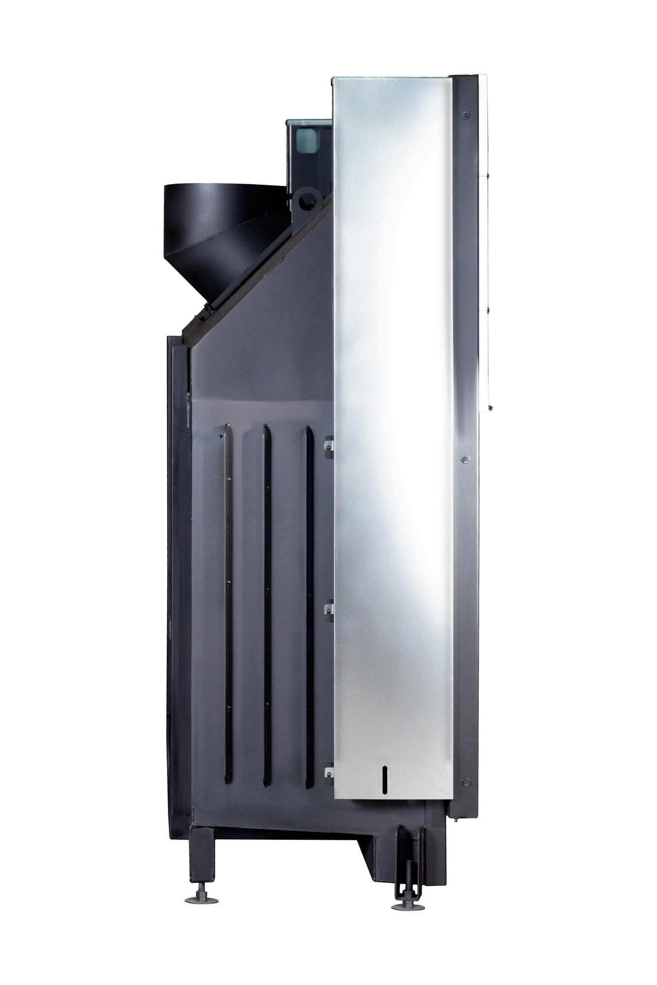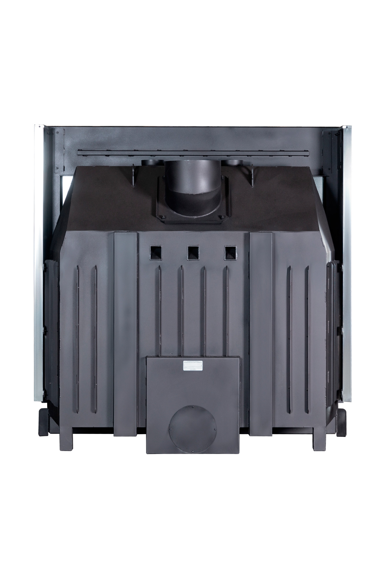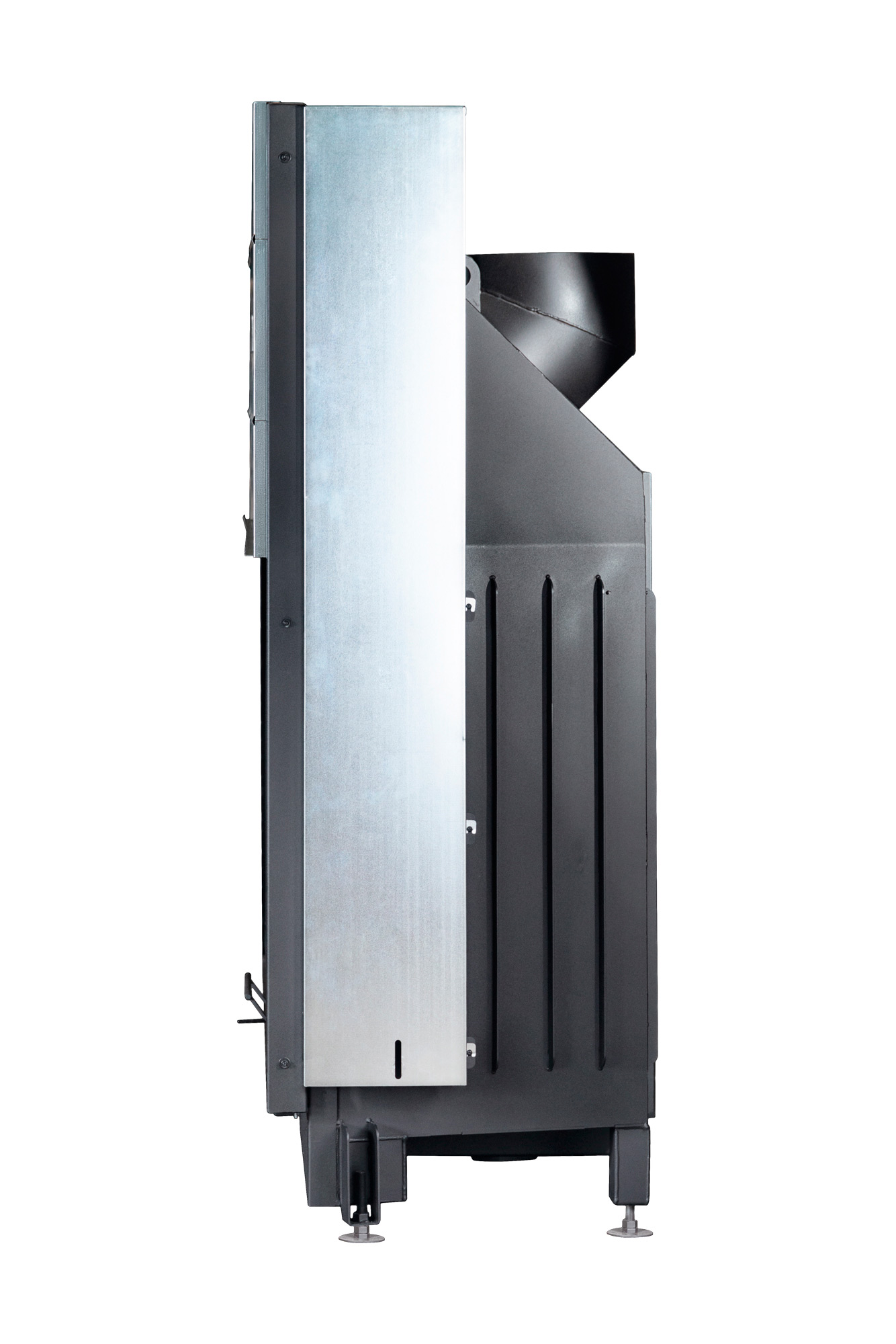Ребра жесткости по всему корпусу топки и встроенные в дымосборник тепловые каналы позволяют снимать больше тепла и отдавать его в помещение путем конвекции. Высокий дымосборник и пламярассекатель не позволяют дымовым газам попадать в помещение при открывании дверцы. Бесшумная и надежная тросовая система с противовесом и жаропрочными подшипниками, позволяет открывать дверцу топки вверх и производить закладку дров в топочную камеру. Под чугунной колосниковой решеткой в днище топки, находится большой зольный ящик, который удобно вынимается. Устойчивые, регулируемые по высоте ножки, позволяют при монтаже установить топку по уровню.